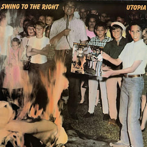 Utopia’s political concept album Swing to the Right spoke to the creeping conservatism of the Reagan years. The cover made a “the more things change…” point by reprinting (and subtly altering) a famous photo from the Beatles record-burnings of 1966, which occurred in response to John Lennon’s “more popular than Jesus” comments. The cover was high-concept in a few different ways. It not only referenced Utopia’s previous album Deface the Music – which served as a Beatles homage/parody – but replaced the original photo’s Beatles album with the Utopia album, making the picture an infinite loop.